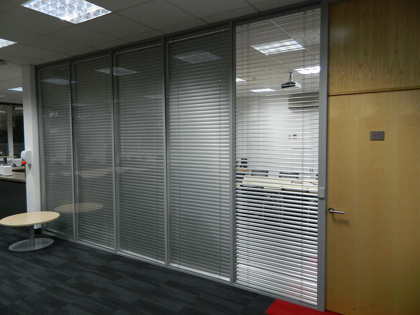 Within this new facility, UL also required a meeting room to accommodate 12 people. By using a fully glazed partitioning system we gave the area a sense of light and space, which could be changed if privacy was required during a meeting with integral venetian blinds.